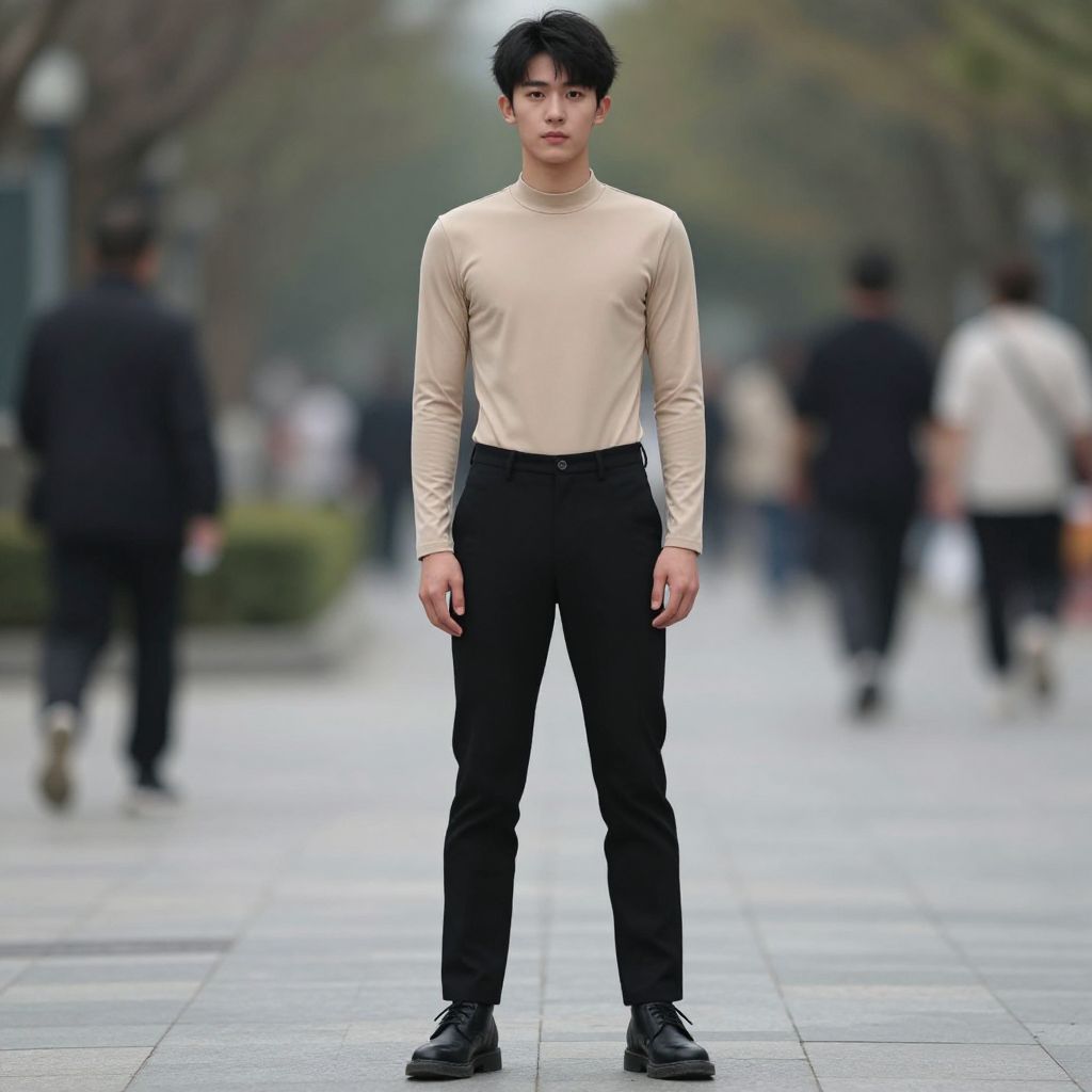 Photograph of an East Asian man standing in a blurred urban outdoor setting. He has short, black, slightly messy hair and a neutral expression. He wears a long-sleeve, beige, fitted shirt and black, high-waisted trousers with black leather shoes. The background features indistinct people, trees, and a paved pathway, with soft lighting suggesting an overcast day. The man's attire is simple and modern, contrasting with the blurred, bustling background. The overall composition focuses on the man, with a shallow depth of field emphasizing him while the background remains out of focus.