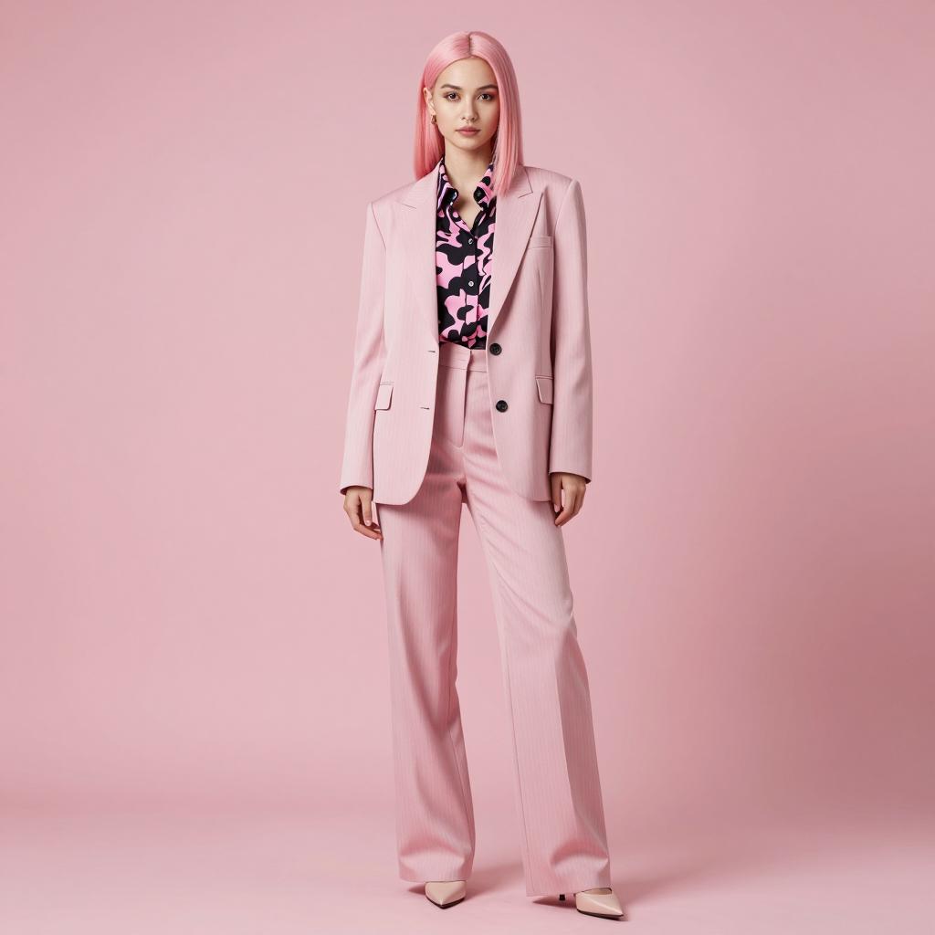 Pink blazer costume, photograph of a young woman, pink hair, shoulder-length, straight, wearing a pink pinstripe suit, black and pink patterned blouse, standing against a solid pink background, neutral expression, studio lighting, fashion model, modern style, full body shot, professional portrait, minimalist background, pink and pink color scheme