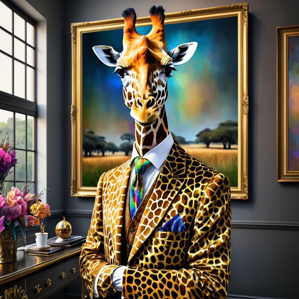 A highly detailed digital painting of a stern-looking giraffe dressed as an artist. The giraffe is wearing an elaborate and colorful suit with patterns that resemble peacock feathers and giraffe spots, paired with a matching tie and white shirt. The background showcases framed landscape paintings, emphasizing an elegant and artistic atmosphere in a gallery or studio setting.