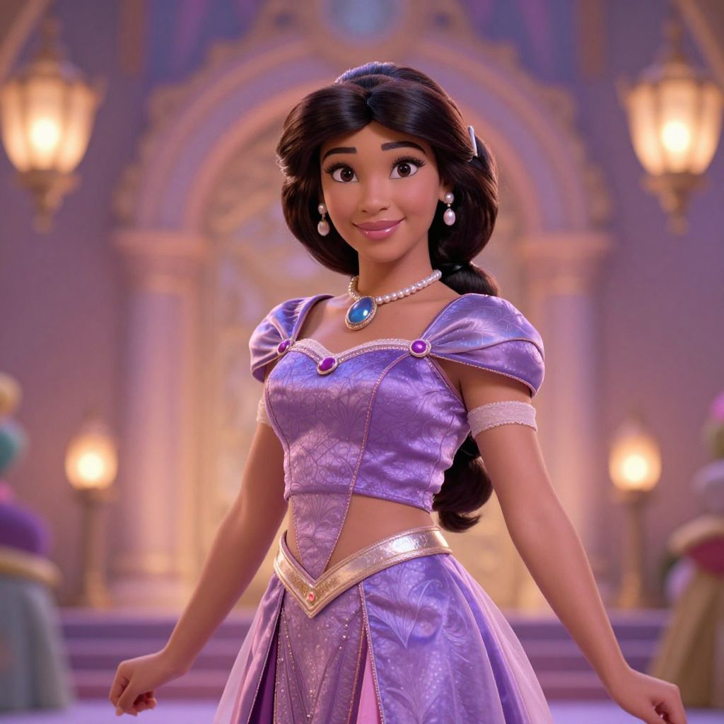 This is a digital CGI image in a Disney-style animation. It features a young woman with medium-brown skin and long, wavy black hair adorned with a small purple headband. She has large, expressive brown eyes and a warm smile. She is wearing a purple, satin-like dress with puffed short sleeves and a gold-trimmed, V-shaped bodice adorned with a blue gemstone necklace. Her skirt has a purple and gold trim. She also wears matching purple earrings. The background is a grand, ornate hall with soft purple walls, arched windows, and glowing lanterns. Other blurred figures in colorful attire are in the background. The overall style is reminiscent of classic Disney princess aesthetics.