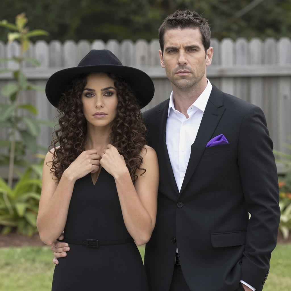 Man in light gray suit, dark hair, leaning against a large crossbow, gripped by a woman in black lace dress, long brown hair, intense expressions, ornate room background. Woman's left hand on man's head, right hand on crossbow.