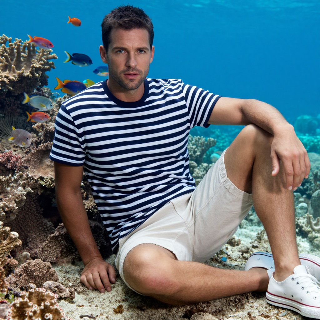 A man, navy and white striped cotton tee, light beige cotton shorts, white canvas sneakers, casual summer vibe, vibrant coral reef tank, colorful fish darting, soft blue lighting, relaxed expression. Man has masculine face and piercing eyes