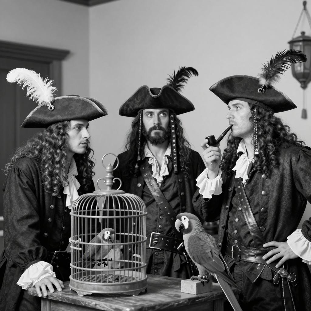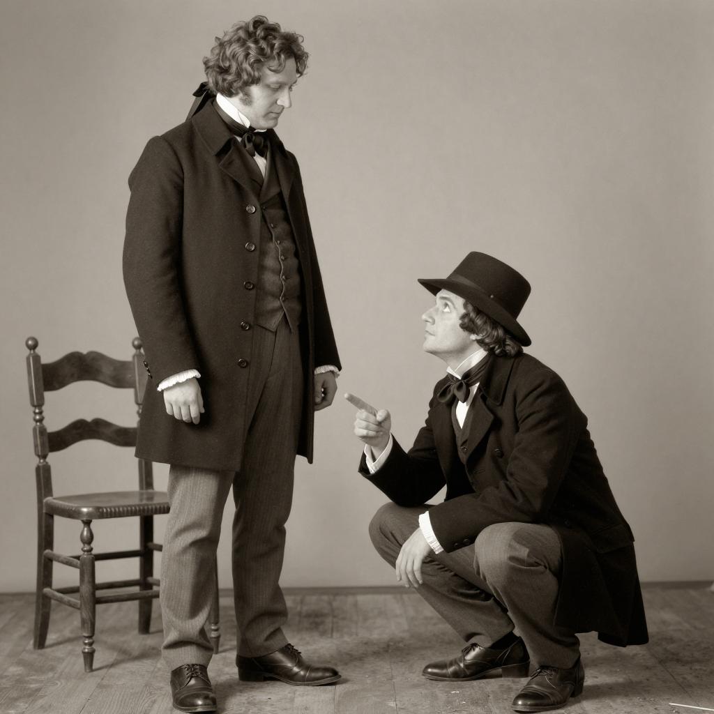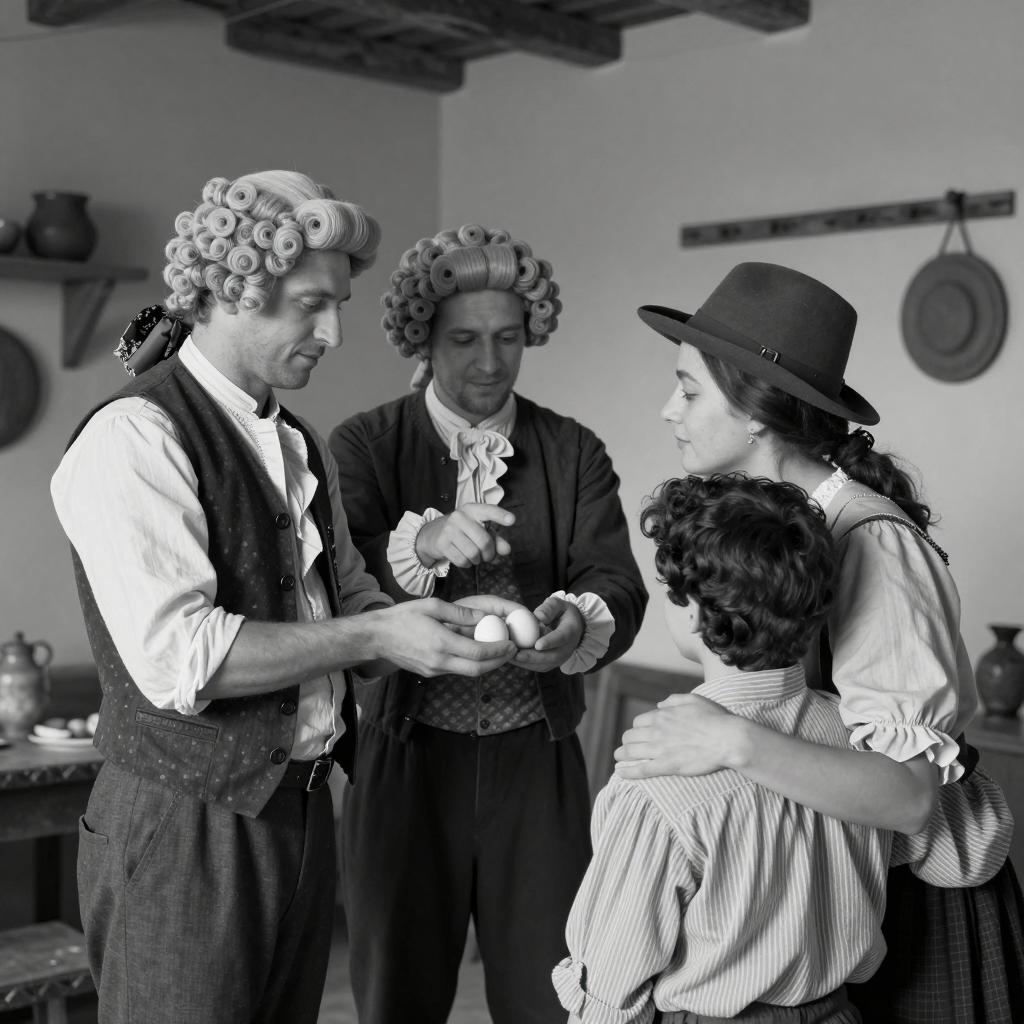 Black and white photograph of two men in 18th-century clothing with elaborate hats, focusing on a table laden with food, drinks, and a goblet. One man pours from a jug, the other looks down. Stone wall background.