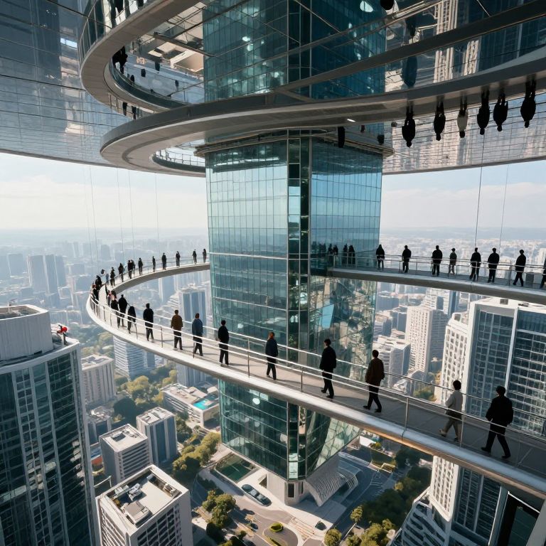 Photograph of a modern, glass skyscraper with multiple circular, elevated walkways. Silhouetted people walk along these walkways, which spiral around the building's exterior. Below, a cityscape with tall white and grey buildings, green trees, and a misty horizon is visible. The glass facade reflects the sunlight, creating a bright and sleek appearance. The walkways are connected with white railings, and the overall style is futuristic and high-tech, emphasizing urban connectivity and architectural innovation. The image captures a dynamic, bustling atmosphere with a clear, blue sky in the background.