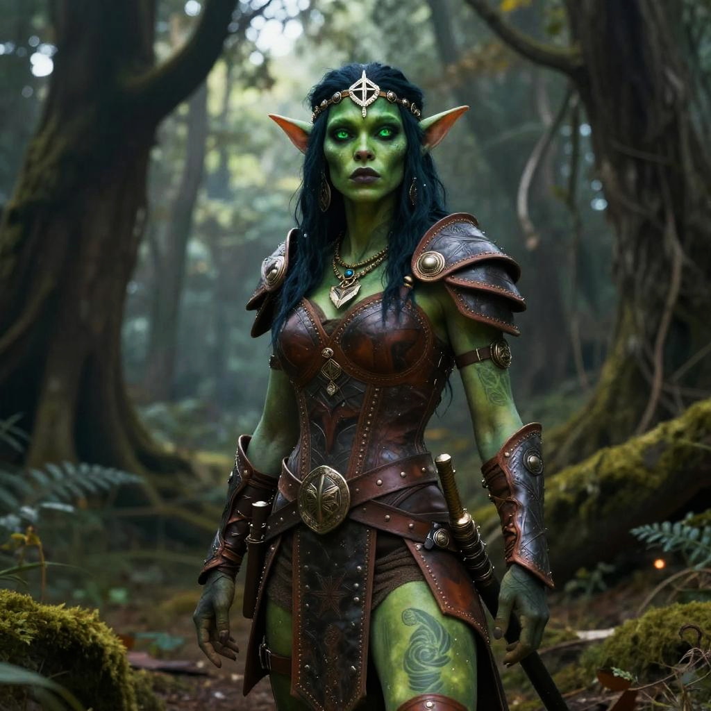 Sexy female goblin with emerald green skin, standing confidently in a mystical forest, wearing leather armor and intricate tribal jewelry, glowing eyes, fantasy art style