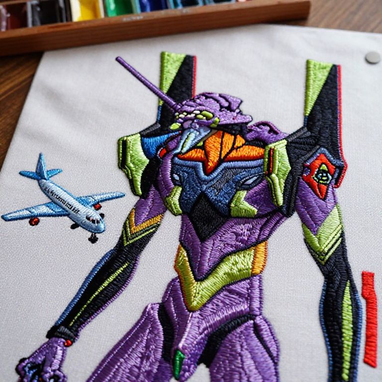 Embroidery Stabilizer Airplane Adventure Evangelion unit 01 pallete , zoom shot, telephoto lens :: hyper-realistic,, evening, octane rendering :: inspired by Katsuhiro Otomo, pixelactivist ::,