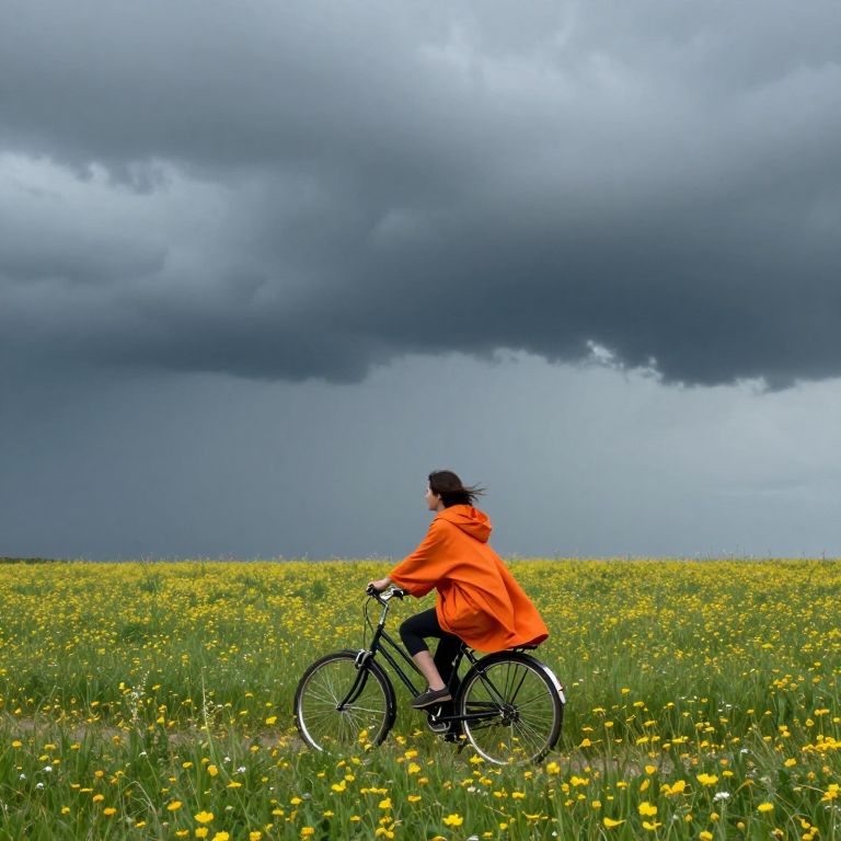 Amidst a tempestuous sky, a solitary figure in a vibrant orange cloak rides a bicycle through a field of wildflowers, her presence a paradox of calm amidst chaos, embodying the resilience of spirit and the quiet defiance of nature’s fury.
