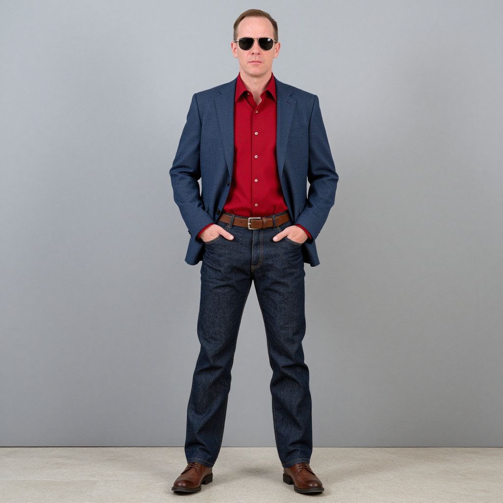 Photograph of a white man standing against a plain gray background. He has short brown hair, wears black sunglasses, a navy blue blazer, a red button-up shirt, and dark blue jeans with a brown belt. His hands are in his pockets, and he is wearing brown leather shoes. The man's expression is neutral, and he stands with his legs slightly apart, creating a confident stance. The lighting is even, highlighting the contrast between his red shirt and blue blazer. The floor is light gray, matching the background.