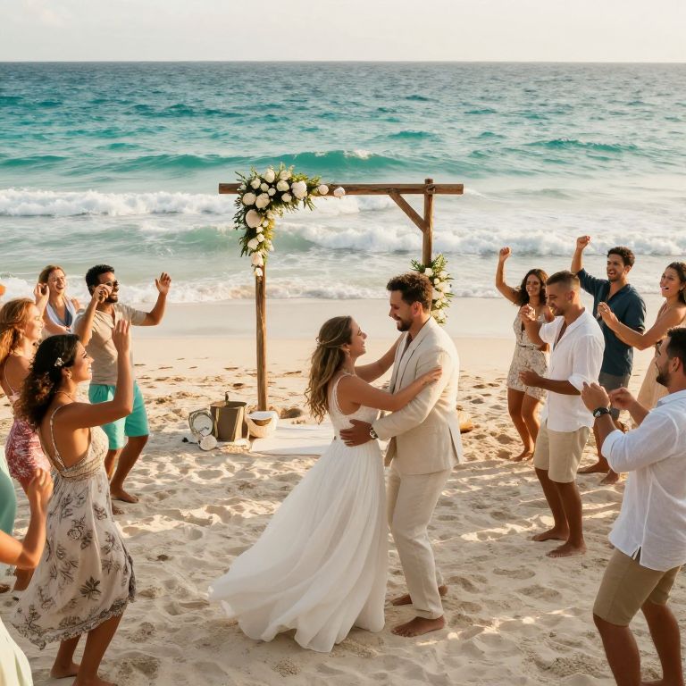Photograph of a bride in a white gown and veil, and groom in a black suit, kissing under a white beach gazebo adorned with floral arrangements