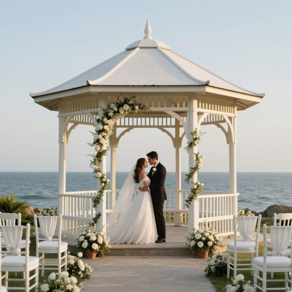 Photograph of a bride and groom standing under a white, octagonal gazebo adorned with white and green floral arrangements, overlooking a calm ocean at sunset. The bride, with long brown hair, wears a white, strapless, ball-gown dress and veil, while the groom, in a black suit, holds her close. Surrounding the gazebo are white chairs with white cushions, and the ground is paved with light brown stones. The sky is clear with a gentle blue gradient, and the ocean's horizon is visible in the background. The overall scene exudes a romantic, seaside wedding atmosphere.