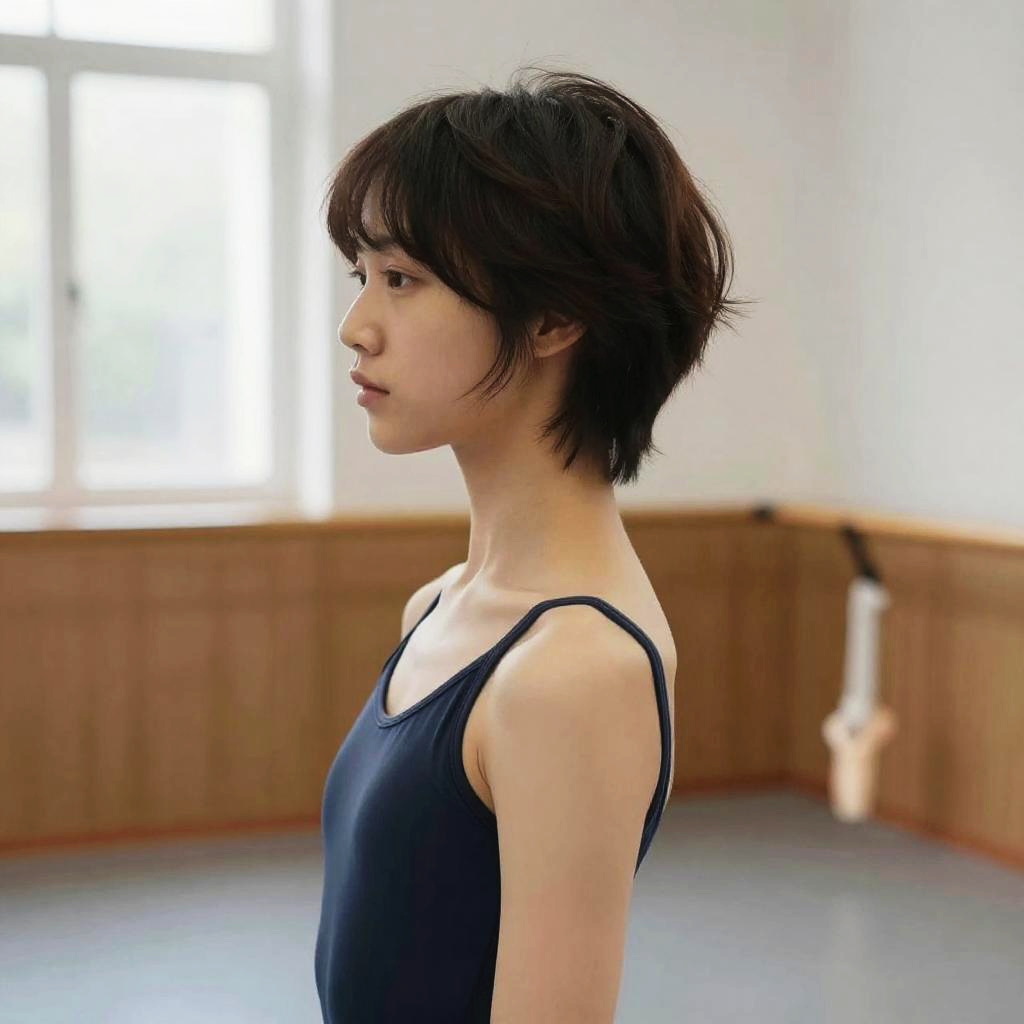Textured Quiff hairstyle on young female dancer, wearing leotard and ballet slippers, in dance studio, captured in fashion editorial style with soft natural light.
