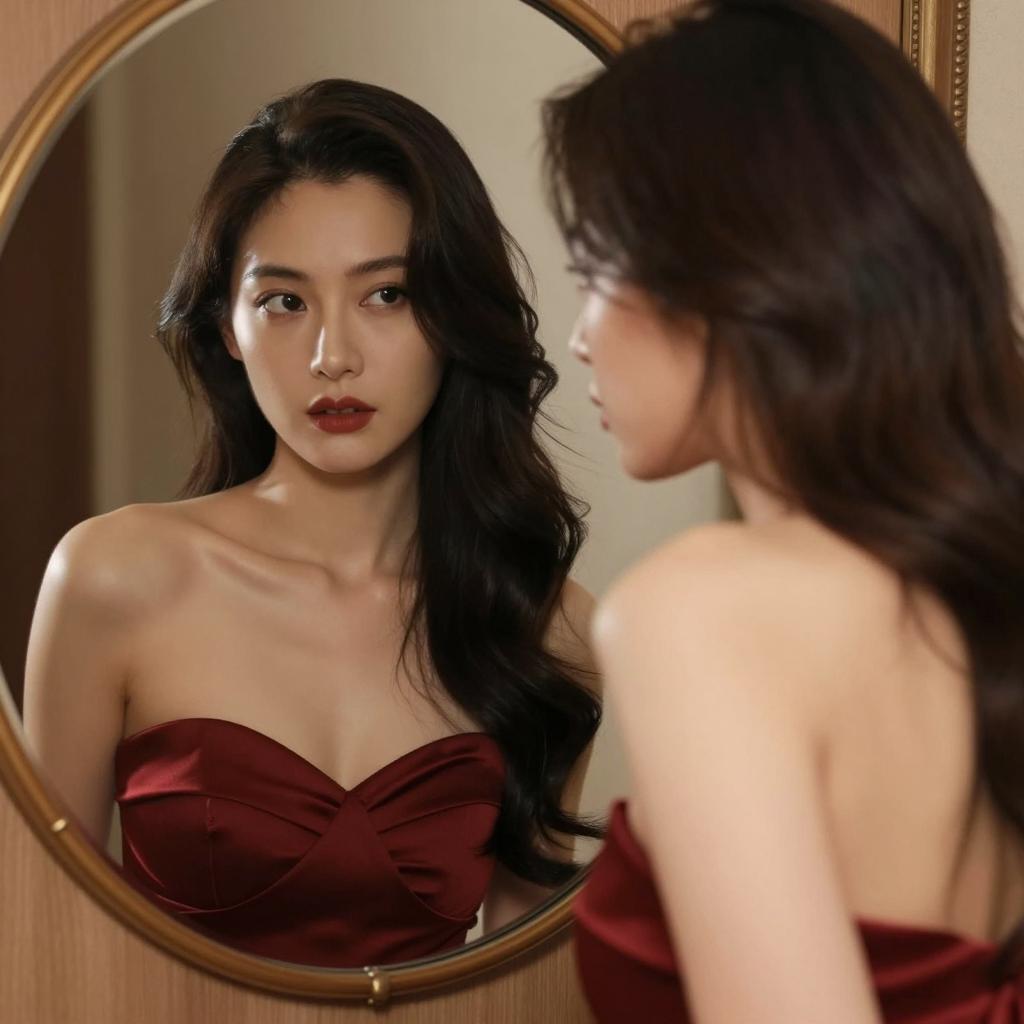 Photograph of a woman with dark, wavy hair, wearing a strapless, deep red dress. She stands in front of a round mirror, reflecting her profile. Her intense gaze is directed at her own reflection. A small circular mirror on the left shows a partial reflection of her face. The background has a wooden wall with a decorative trim. The lighting is soft, casting gentle shadows. The woman's skin is fair, and her expression is serious. The mirror and reflection create a sense of depth and introspection.