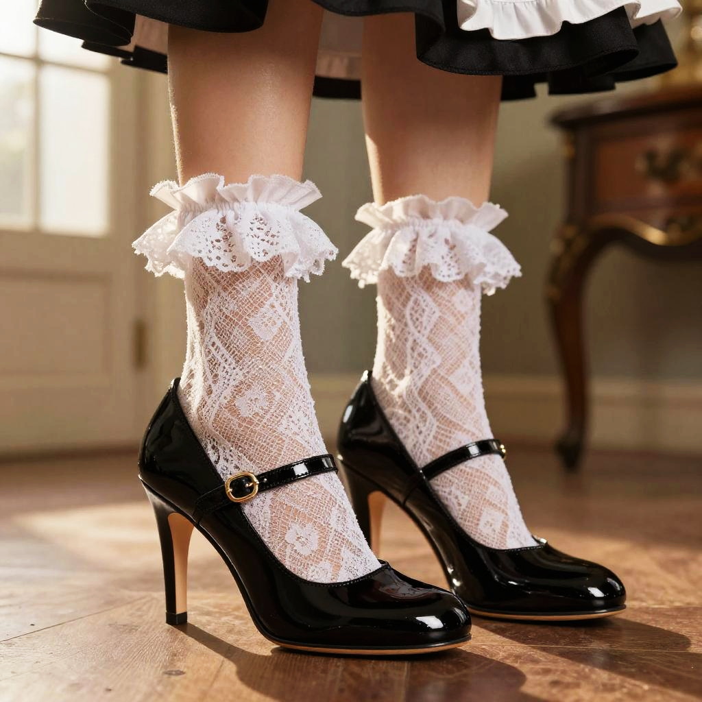 Maid heels, shiny black patent leather with delicate straps, paired with frilly white lace stockings, indoors in a vintage French chateau setting, warm sunset ambiance