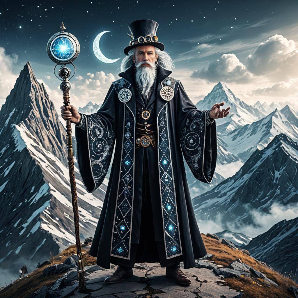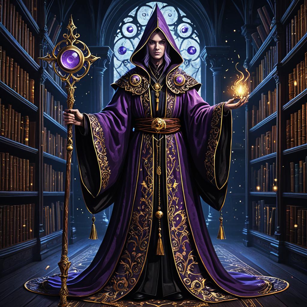 Full-body cartoon illustration of a intriguing lavender-eyed mage, wearing ornate robe with gold embroidery, magic staff and enchanted amulet, in a dark gothic style, arcane library with floating books, high-quality, highly detailed.