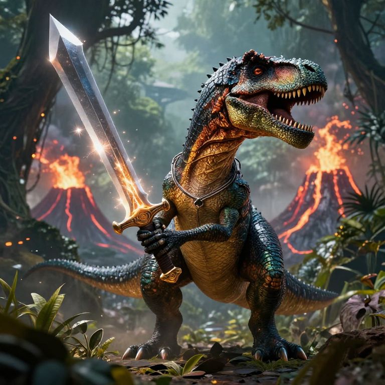 Dino-sword: a fierce dinosaur warrior wielding a massive glowing sword, standing in a prehistoric jungle with volcanic eruptions in the background, epic fantasy style, highly detailed scales and gleaming blade, dynamic lighting