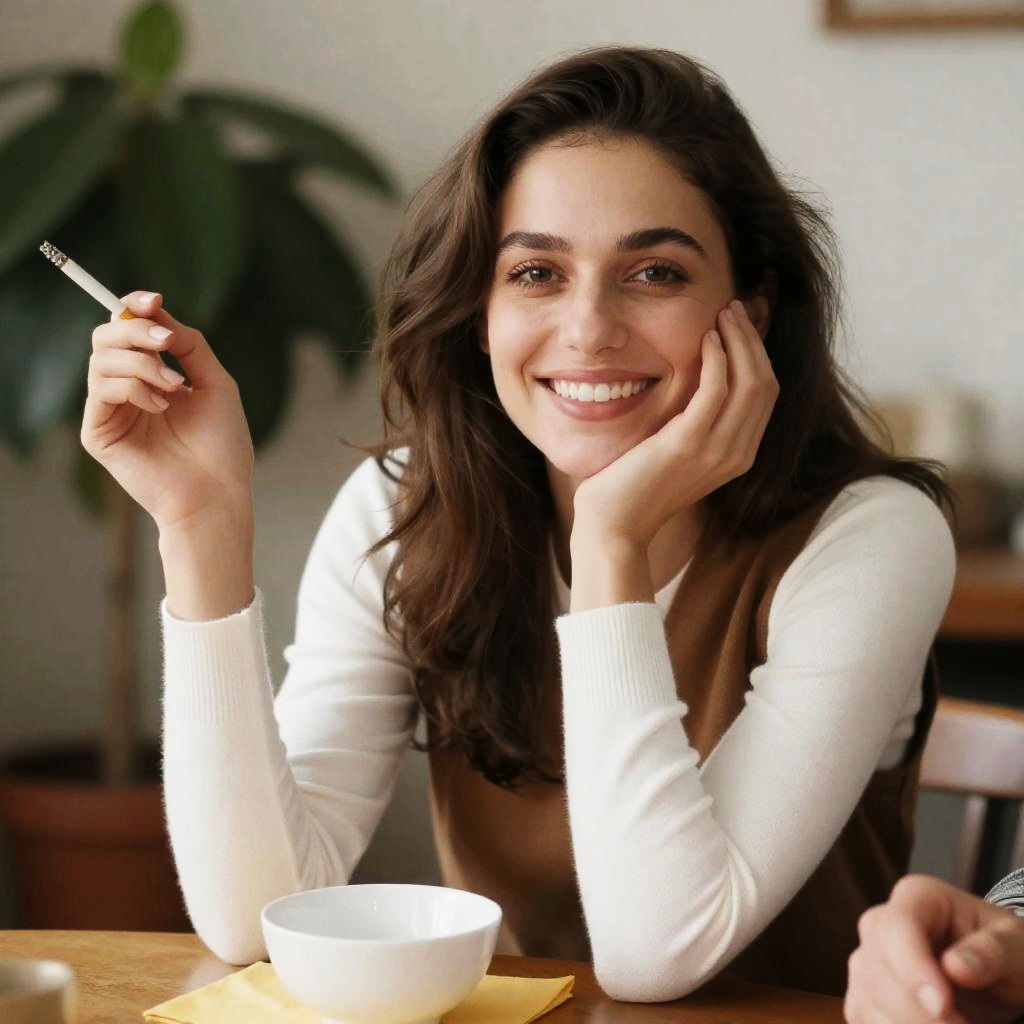 Photograph of a woman with long brown hair, wearing a white sweater and dark vest, holding a lit cigarette in her right hand, resting her chin on her left hand. Background includes green leafy plants. She has a thoughtful expression. Table with papers in foreground. She is seated, slightly angled to the right.