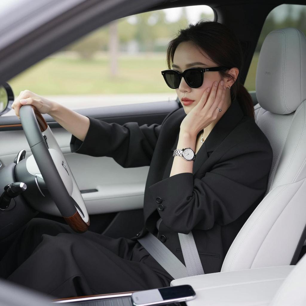 Woman with dark hair in a ponytail, wearing black sunglasses, black blazer, and black pants, sitting in a car. She holds the wooden steering wheel with her right hand, resting her left hand on her cheek. White leather seats, iPhone on the center console. Watch with a silver band on her left wrist. Light greenery visible through the car window.