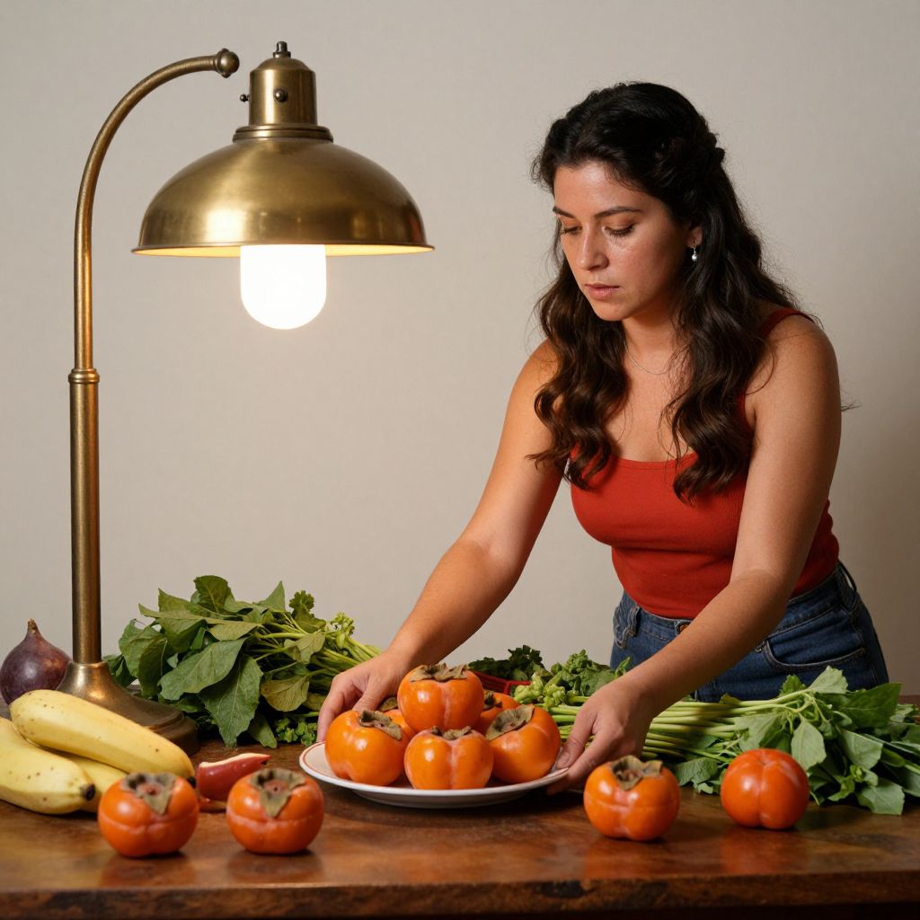 Woman presenting a plate of vibrant persimmons while arranging fresh produce on a wooden table, illuminated by a vintage brass lamp above, in a scene reminiscent of Diego Rivera's style.