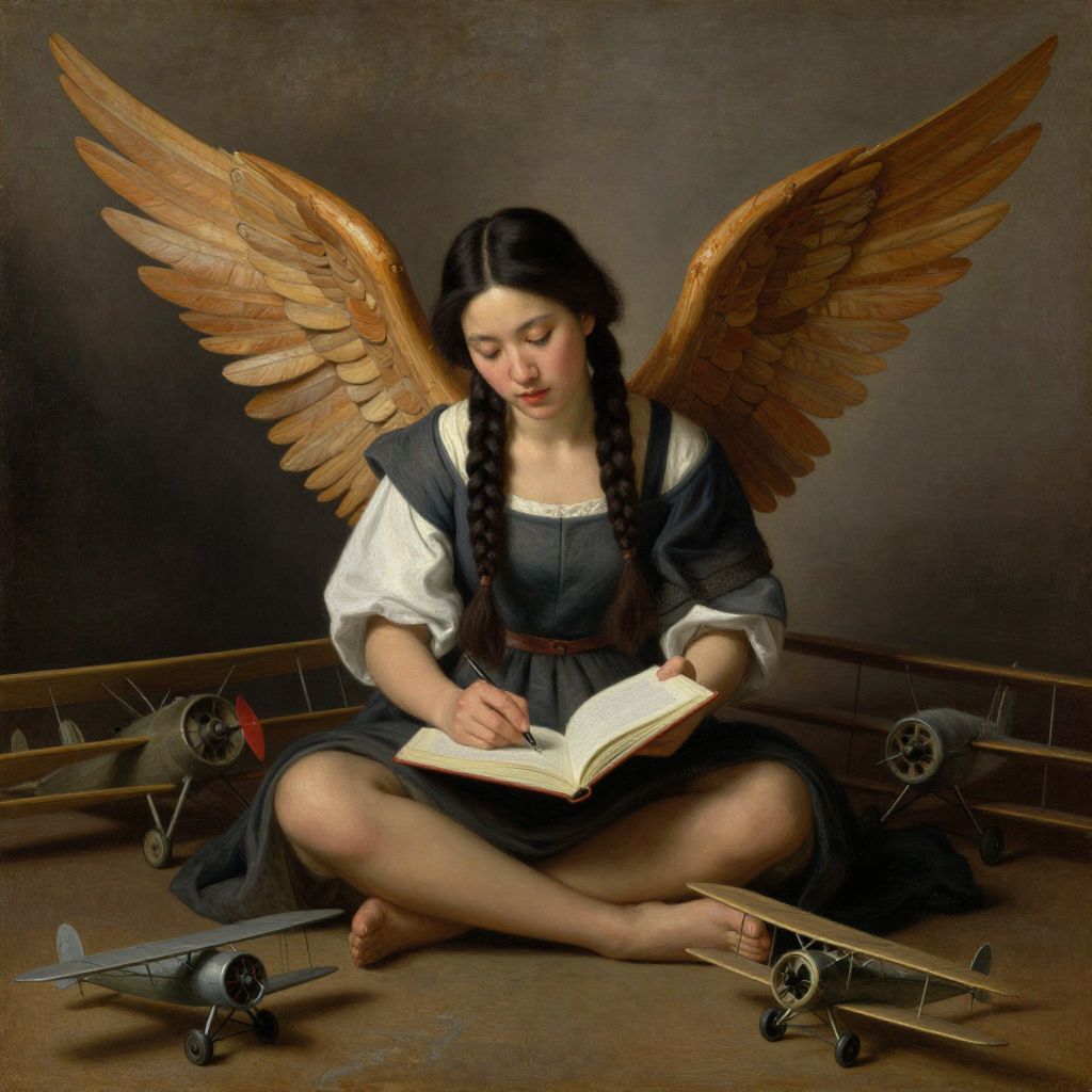 A digital painting depicts a young woman with large, golden wings, sitting cross-legged on the floor. She has fair skin, long black hair in braids, and wears a white blouse with a dark blue dress. She is focused on writing in an open book with a quill. Surrounding her are four small, vintage biplanes with propellers. The background is a dark, textured gradient, emphasizing the subject. The style combines realism with a touch of fantasy, reminiscent of classical art. The woman's serene expression and detailed wings contrast with the simple, rustic setting and the mechanical planes.