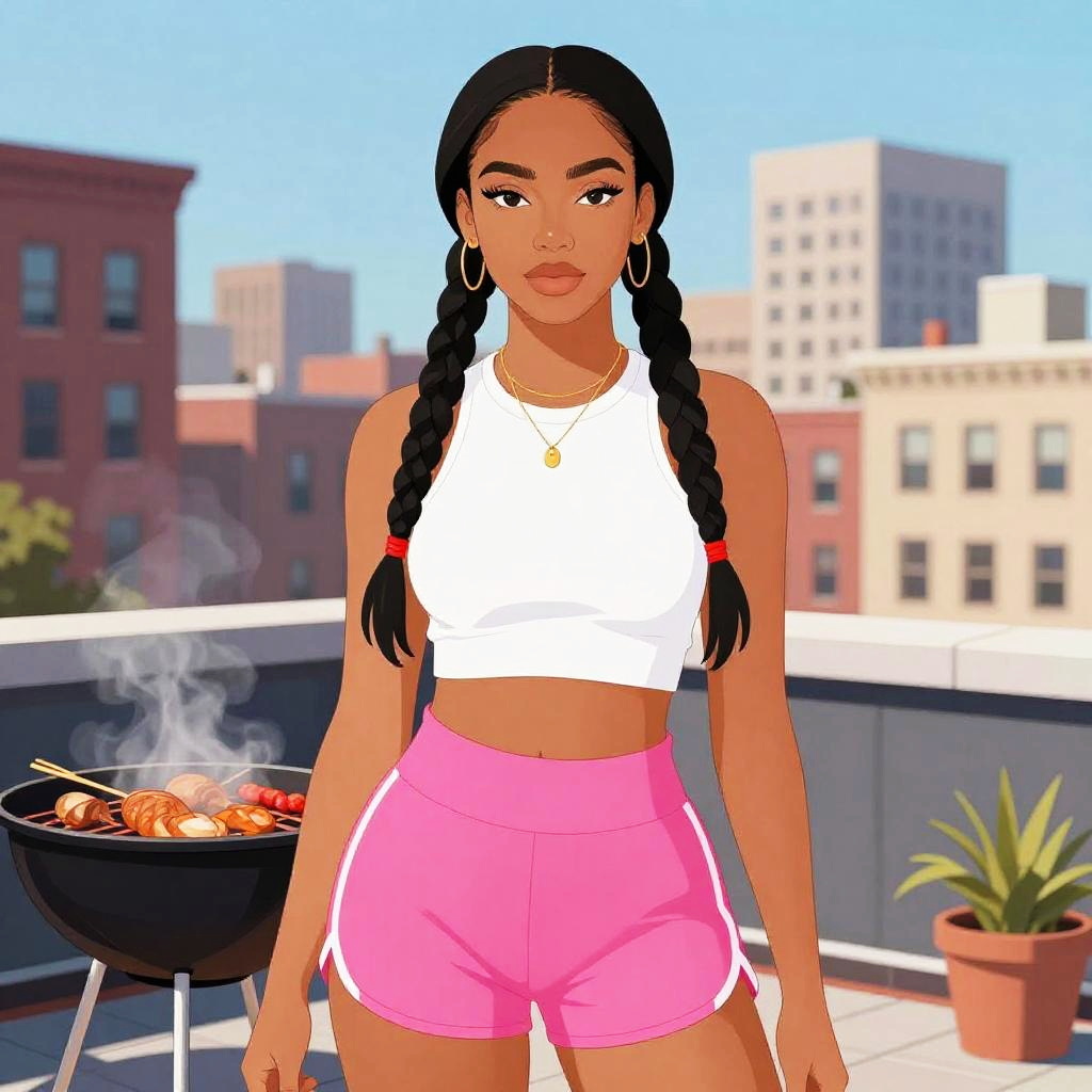 A svelte woman in a sporty chic outfit featuring a white crop top and hot pink athletic shorts, minimal jewelry, and long braids with red accents, stands confidently in a vibrant city rooftop barbecue setting, illustrated in the style of IDW Publishing. Sexy. Pretty face and beutiful eyes