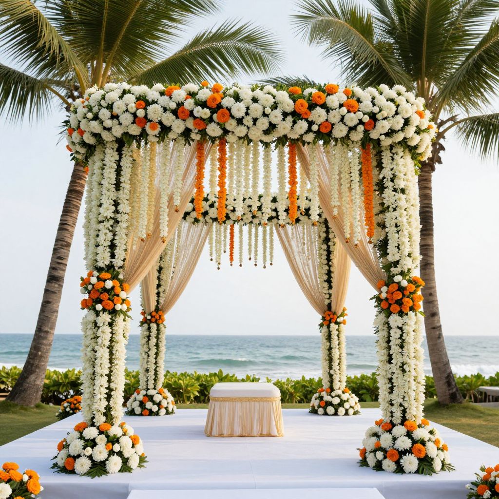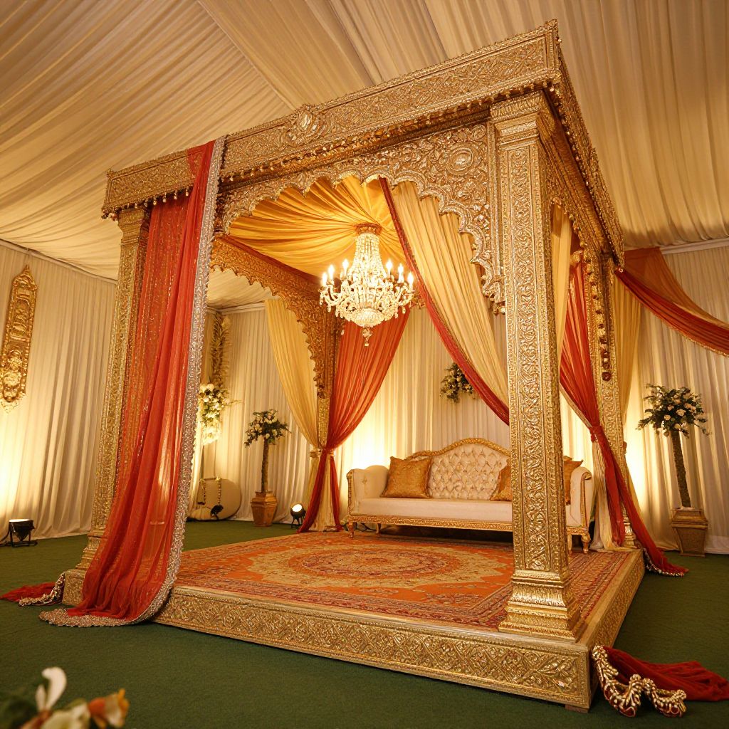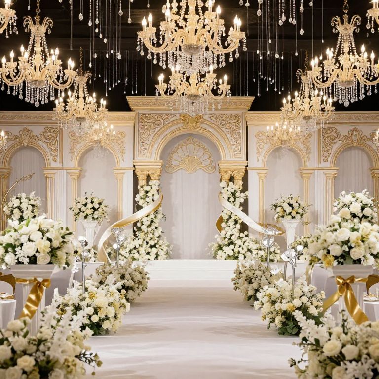 Wedding theme background showcasing luxurious white and gold decor, crystal chandeliers, grand floral centerpieces, silk ribbons, and an ornate archway, designed for a royal and opulent wedding setting.