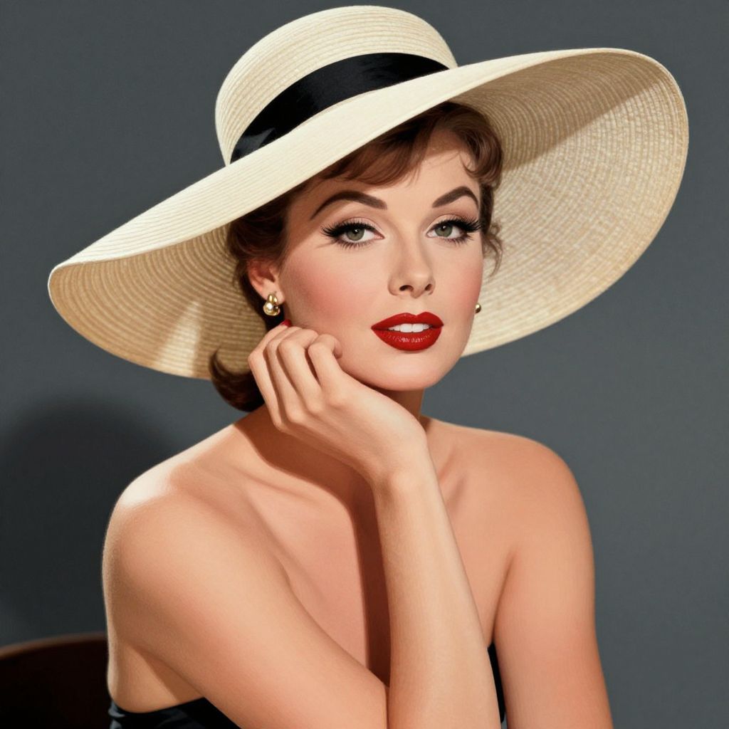 Photograph of a fair-skinned woman with short, wavy brown hair, wearing a wide-brimmed beige sun hat with a black band. She has bright red lipstick, dark eyeliner, and wears red nail polish. Her hands are gently touching her cheeks, showcasing a silver ring on each hand. She is topless, with bare shoulders visible. The background is a solid teal color. She has a glamorous, vintage 1950s style, with a confident and alluring expression. The lighting highlights her facial features and hat's texture.