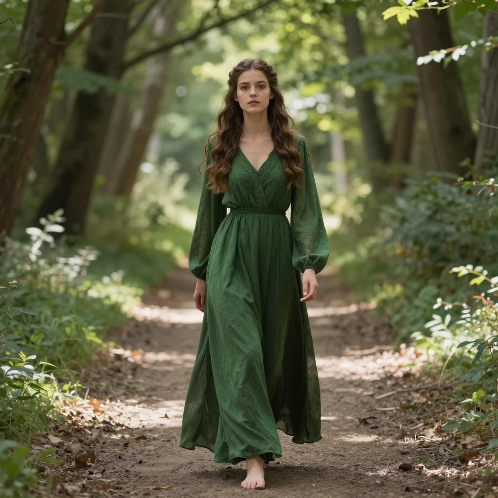 Tattered fairy dress, photorealistic, beautiful young woman, standing in a sunny forest, wearing a bohemian-style, sleeveless, beige dress with ruffled layers, brown hair, wearing a green leafy crown, sunlight filtering through trees, soft focus, natural light, serene expression, light green and brown background, summer, delicate fabrics, earthy tones, magical forest atmosphere, outdoor, nature-inspired fashion, gentle breeze