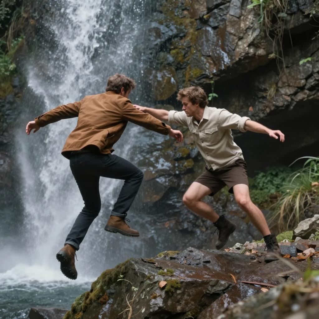 Two men in black clothes, one kicking the other mid-air, on a rocky beach with a blue sky background. Kicker has dark, messy hair, kicking man has curly hair. Rocks and sand form the foreground and background. Kicking man's legs are extended, intense expressions not visible.