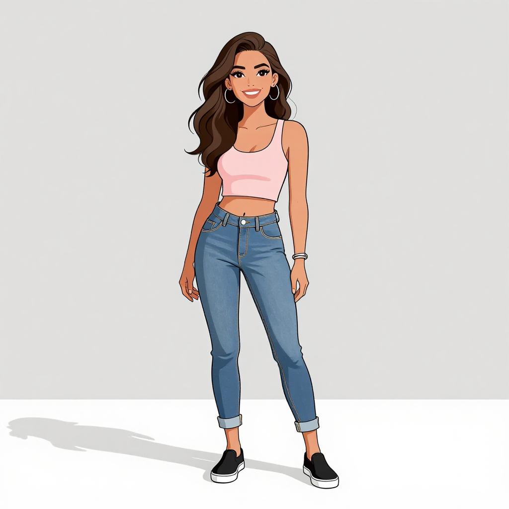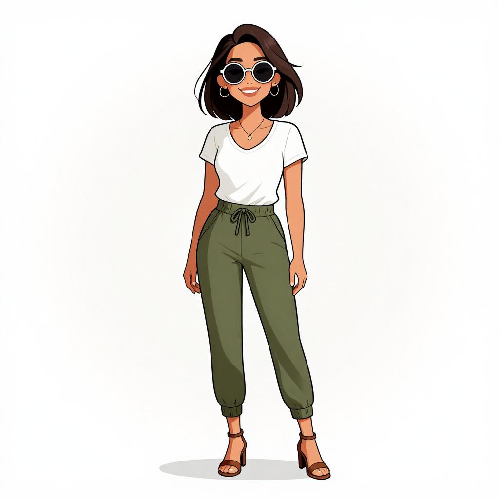 Woman with pretty face and pretty hair. smiling Woman, casual bohemian, loose-fitting white t-shirt, wide neckline, cuffed short sleeves, tie-front at waist, tie-dye jogger pants in shades of pink and peach, tapered fit, drawstring waist, ribbed ankle cuffs, black ankle boots with a slight heel, studio background. --sref 1467