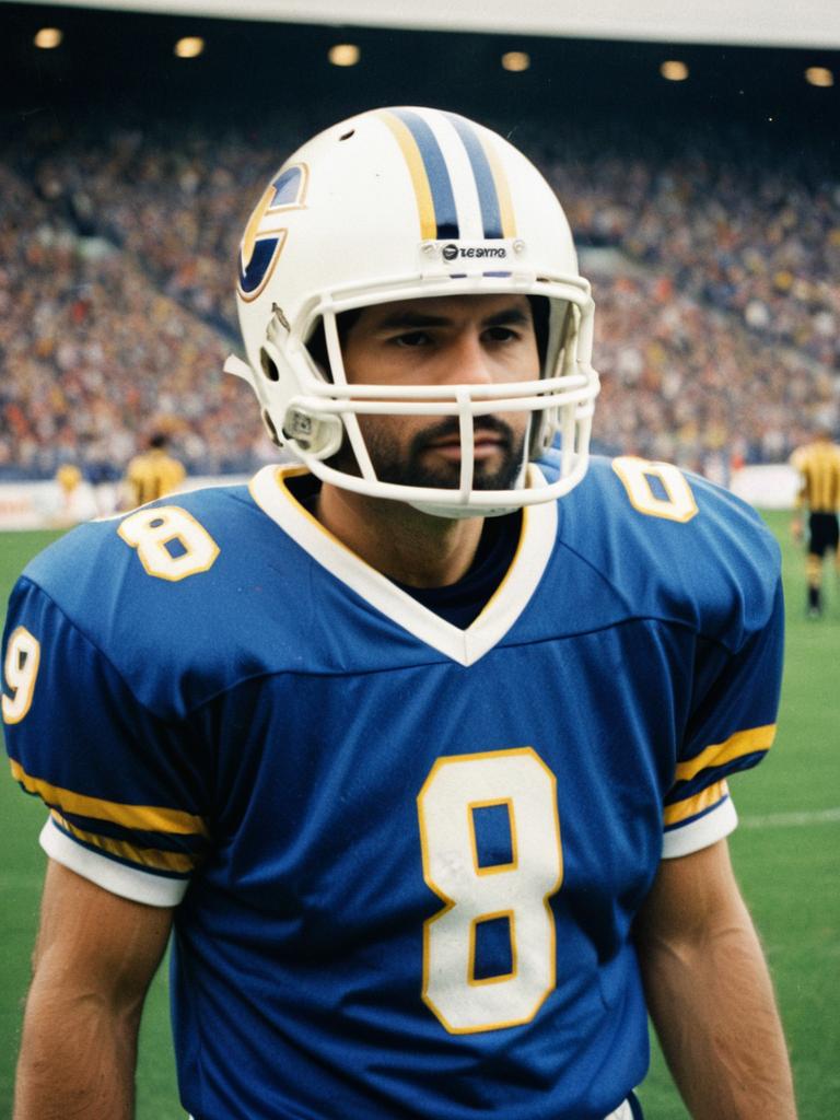 Man in Football Jersey Costume, candid portrait during game, natural daylight