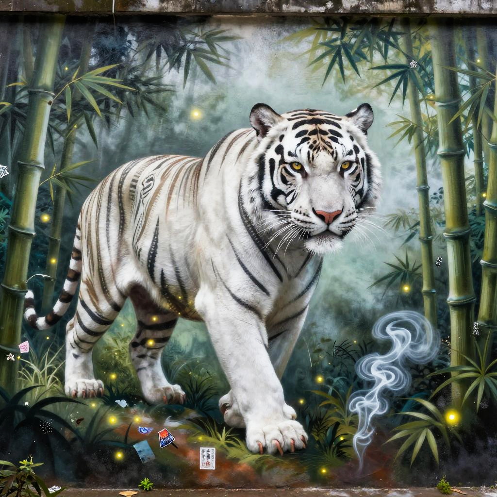 Slick neon-armored fox with glowing visor in shadowy city back alley filled with mist and reflections, rendered as glitch-infused street mural featuring layered spray texture, vivid colors, high detail, dynamic composition, rim lighting, subtle film grain blended with crisp vector edges, bold outlines, sticker and stencil accents, atmospheric haze, wet ground reflections, smoke forming playful shapes, balanced negative space, photoreal textures merged with print imperfections, dramatic glow highlights, island-to-city vibes, clean focal point, cohesive palette, energetic yet polished finish