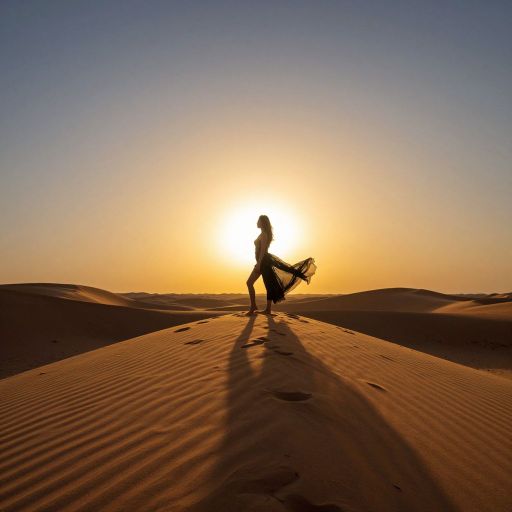 Silhouette of a woman in a flowing black dress stands atop a golden sand dune as the sun sets in vibrant hues, casting long shadows across the undulating desert landscape.