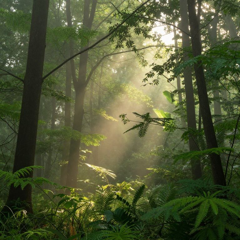 Photograph of a sunlit forest with tall trees, dense green ferns, and misty light beams filtering through the foliage.