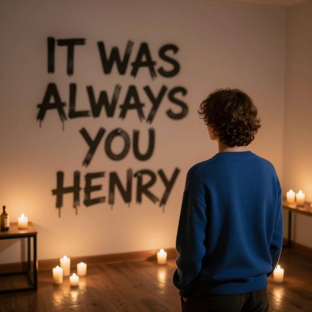 Dark room, person with short brown hair and blue sweater facing graffiti-covered wall. Graffiti reads "IT WAS ALWAYS YOU HENRY". Numerous lit candles scattered on table and floor. Warm candlelight illuminates wall. Person's back to camera.