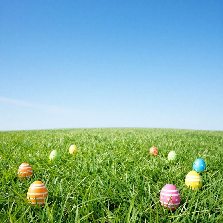 Photograph of vibrant Easter eggs (pink, blue, yellow, purple) scattered on sunlit grass with white daisies, surrounded by blossoming
