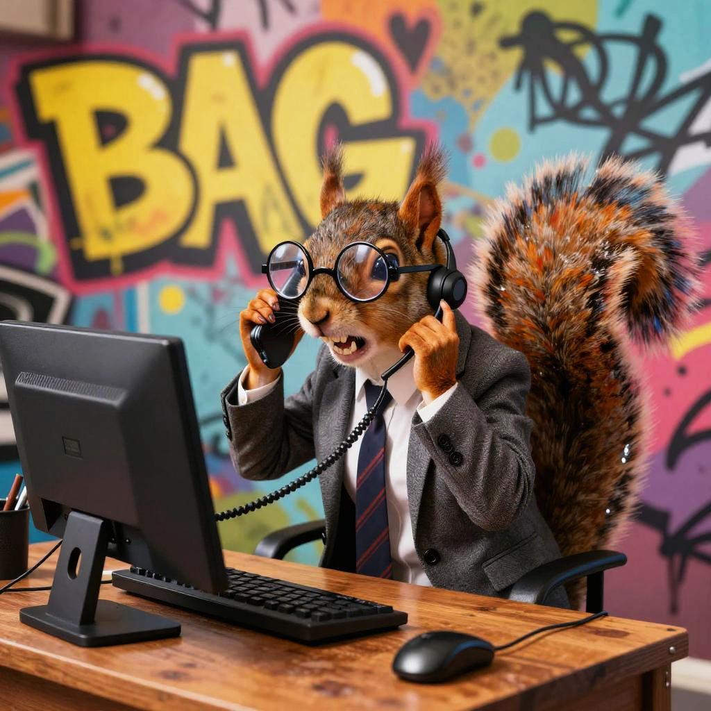 A squirrel in a tailored blazer wearing tiny round spectacles angrily making a phone call to tech support while sitting at a desk with a computer, captured in a graffiti-inspired urban pop art with bold colors and high-energy lines scene full of expressive and funny actions.