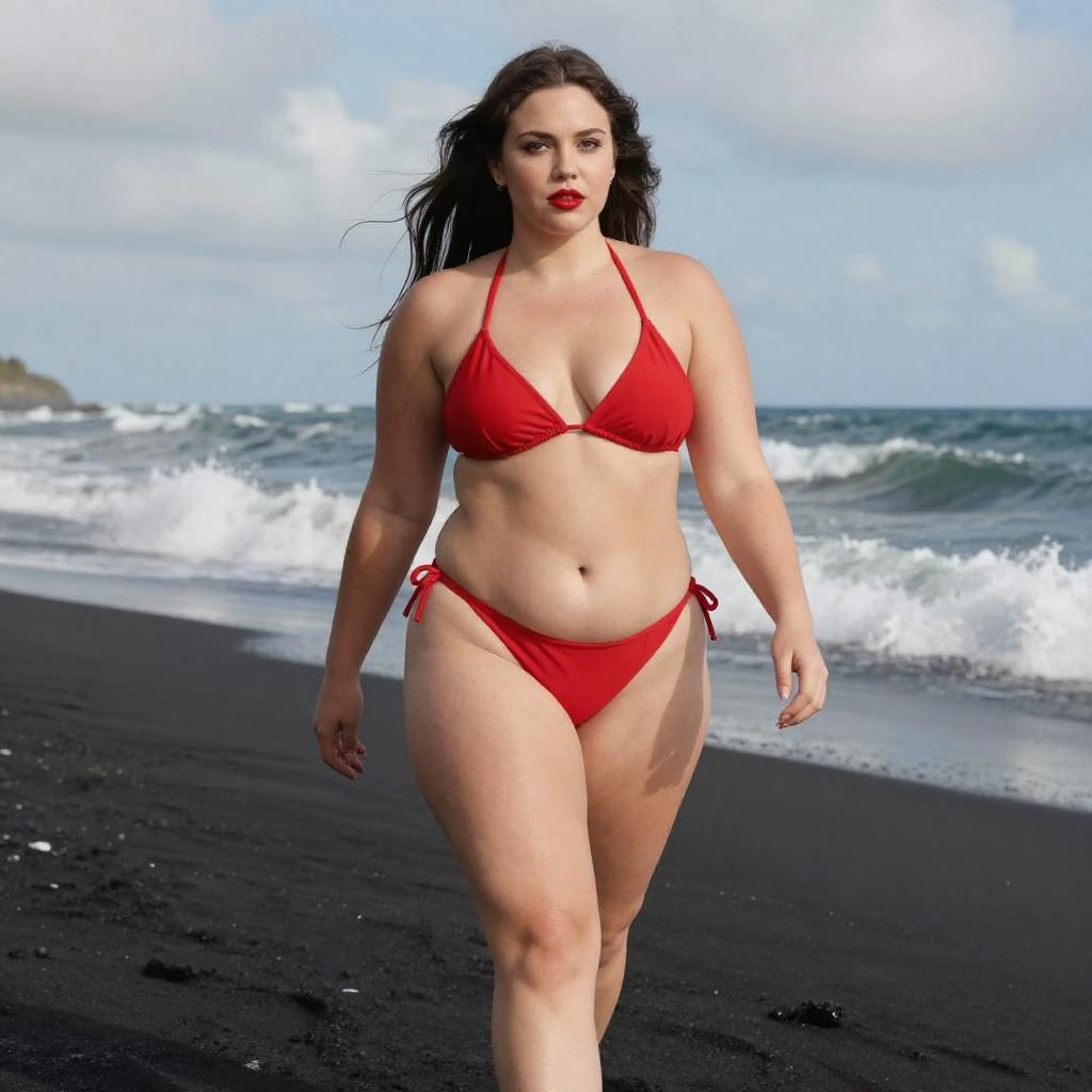 Photograph of a curvy woman with light skin and long brown hair, wearing a black one-piece swimsuit, standing on a sunlit wooden deck of a boat. She is reading a magazine, with the ocean and clear blue sky in the background. Sunlight highlights her figure and the ure of the deck.