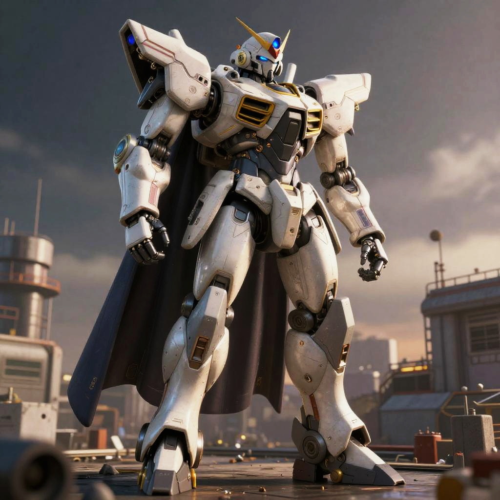 ((best quality)), ((masterpiece:1.2)), (extremely detailed:1.1), (8k, high quality, cinematic, hyper realistic, illustration, letterbox), (autodesk maya, vray render, ray tracing, hdr), (16mm focal length, f/4 aperture, dynamic perspective, deep depth of field), (3D model, full body, giant mecha, standing solo, brutal robotic armor, high-tech cloak, industrial rooftop background), bloom:0.25, rim lighting, soft lighting, low key)