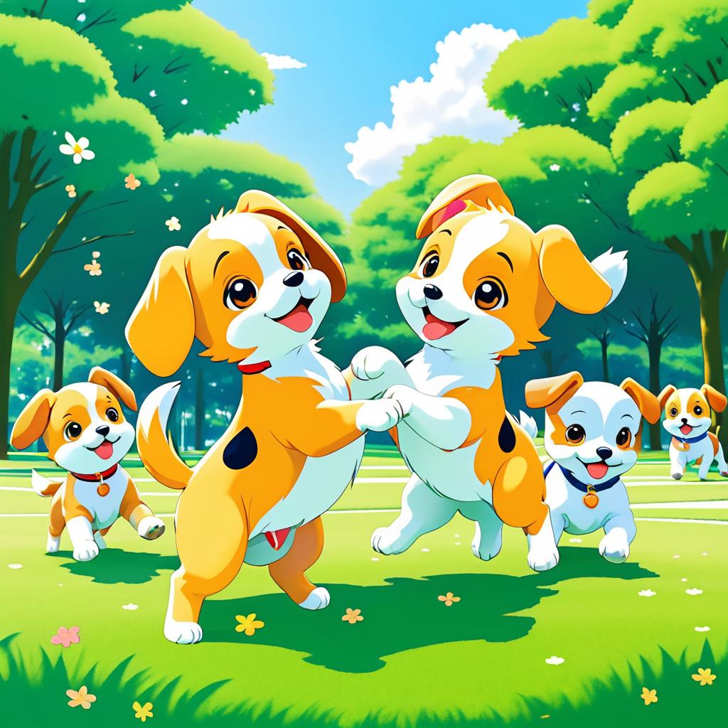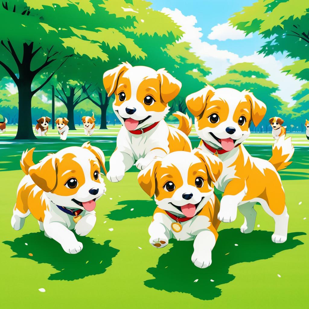 Poster of adorable puppies playing in a park, stylized as anime art by Naoko Takeuchi.