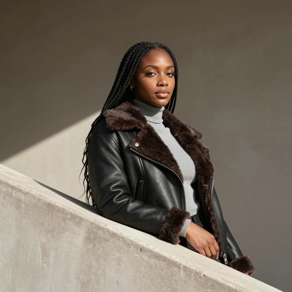 Sexy busty woman in car, seated in compact hatchback with sporty bucket seats wearing off-the-shoulder top with skinny jeans and ankle boots on Black woman with long braids and bold highlighter, twisting slightly to look back over her shoulder toward the camera, one hand on the steering wheel in quiet back road with open fields beyond the glass under low warm side light entering from the open door, dark interior shadows, captured from angled view from behind the driver seat looking forward, cinematic atmosphere, shallow depth of field, ultra-detailed