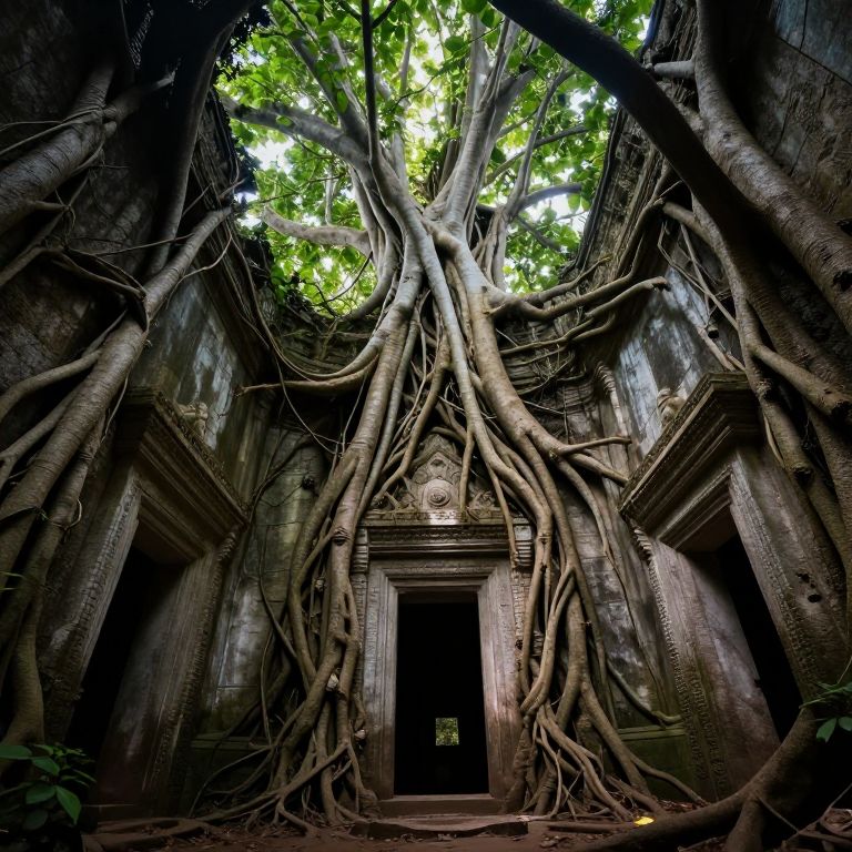 Photograph of ancient, overgrown temple with massive tree roots wrapping around dark, weathered stone walls and doorway, bright green leaves filtering sunlight above.