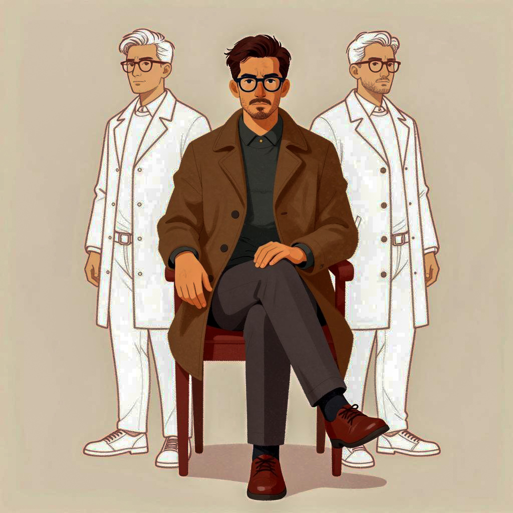 Illustration of three men with short dark hair, glasses, and serious expressions. Central man in brown coat, gray pants, red shoes, sitting on red chair. Left and right men in red line sketches, wearing white coats. Background is beige with watercolor ure. Central man's right hand on chair arm, left hand on lap. Central man's gaze forward. Red line sketches behind and to the sides of central figure.
