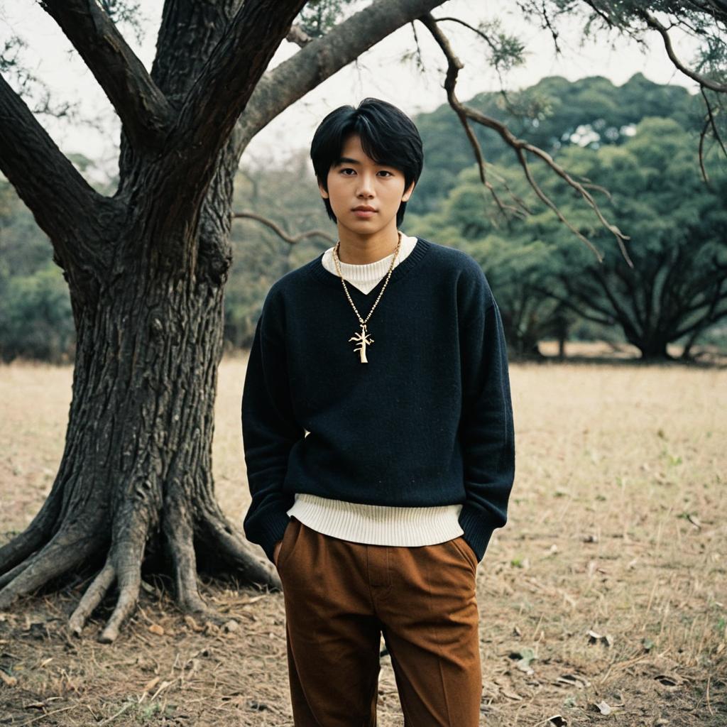 A young Asian male with black hair stands outdoors near a large tree. He is dressed in a black sweater over a white shirt and brown pants. He wears a distinctive gold necklace with a tree-shaped pendant. The background shows a natural, slightly blurred landscape with more trees and dry grass.