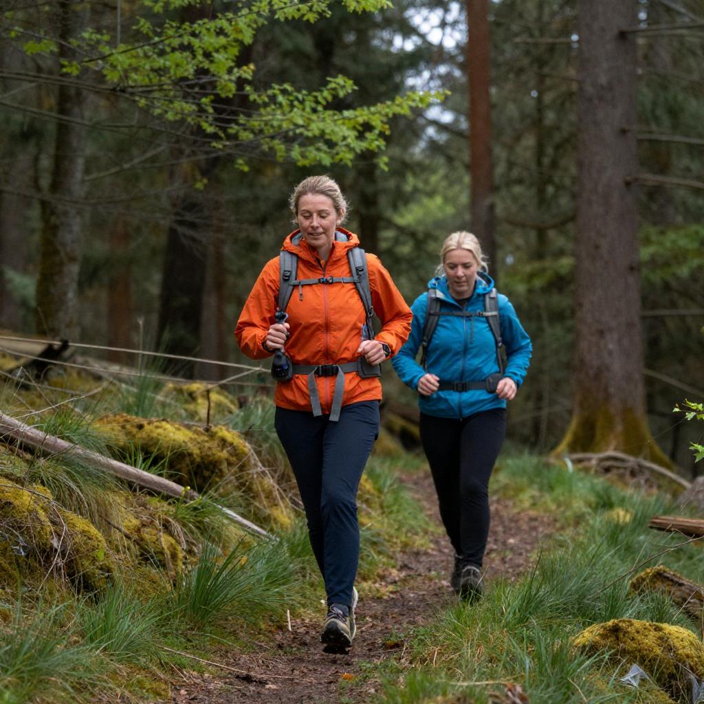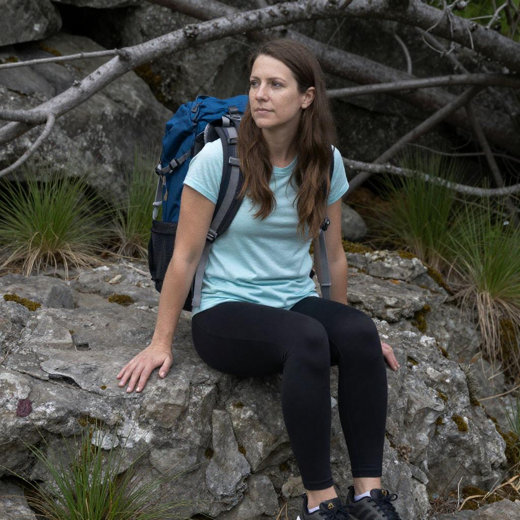 Woman with long brown hair, wearing a blue jacket, black pants, and gray shoes, sitting on a mossy log in a forest. She looks to the right with a calm expression. Tall pine trees in background. Black camera equipment beside her.