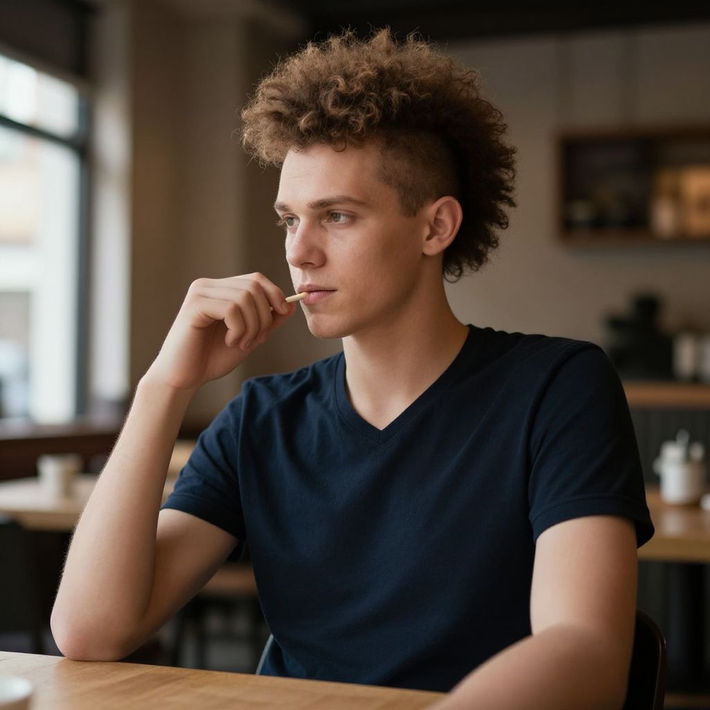 Afro Mohawk, fit European man standing in a trendy café, relaxed posture, soft natural light, detailed facial features