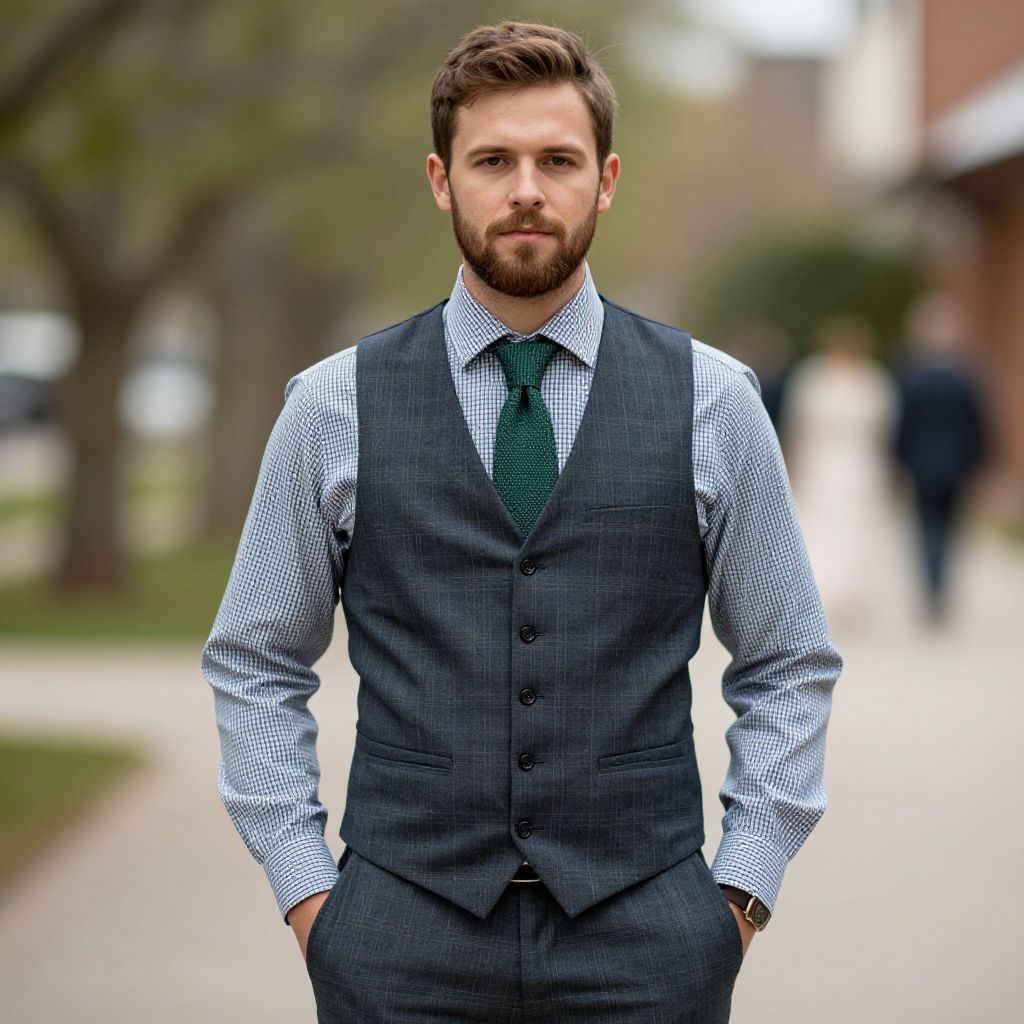 Casual fall wedding attire, 1boy, male focus, solo, vest, necktie, facial hair, shirt, hands in pockets, realistic, plaid, blurry, blurry background, pants, beard, plaid shirt, outdoors, green necktie, looking at viewer, brown hair