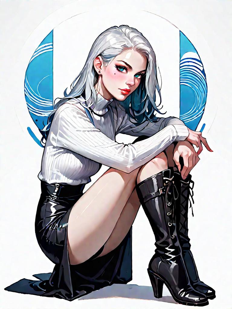 Full body digital illustration of a woman with a realistic face and long braid, wearing a ribbed knit heather grey mini dress with short puff sleeves and a square neckline. She is seated, showing a body-hugging silhouette and thigh-length dress, paired with glossy black knee-high boots and silver hoop earrings, holding a small blue structured handbag. White studio background.