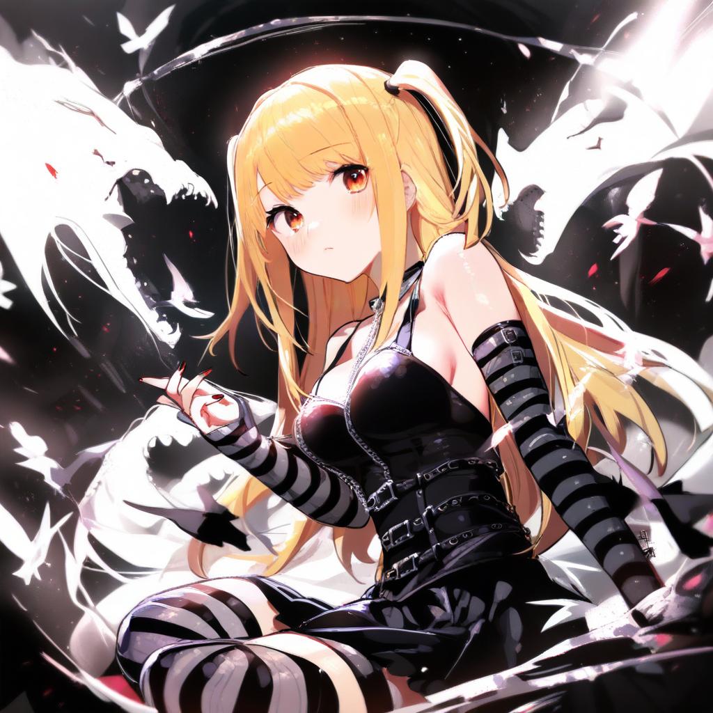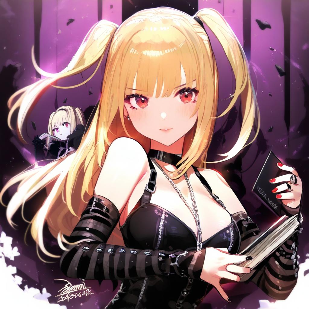 Amane misa, death note, 1girl, red eyes, blonde hair, long hair, two side up, medium breasts, black dress, bare shoulders, detached sleeves, nail polish, goth fashion, goth fashion, by artist ejami, animagine
