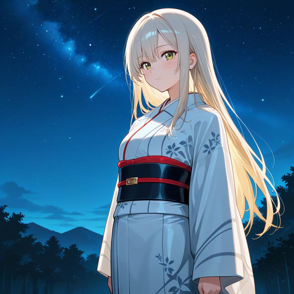 Anime-style digital artwork of a young woman in a white floral kimono, standing by a moonlit lake, with a starry night sky and distant
