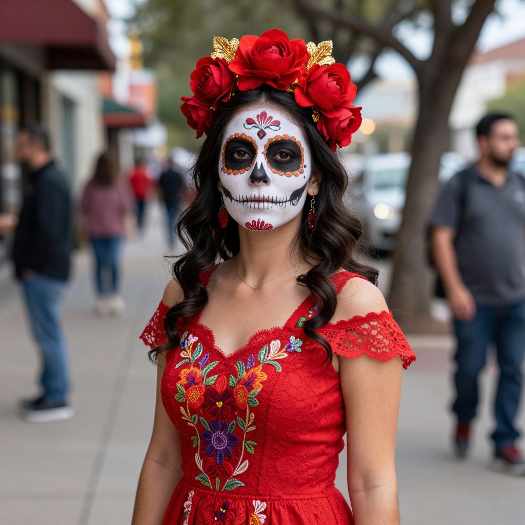 Woman celebrating Dia de los Muertos in Austin, Texas, wearing a vibrant red floral crown with gold accents, a detailed sugar skull makeup design, and a matching red lace dress with floral patterns, standing on a sidewalk with blurred pedestrians and storefronts in the background.